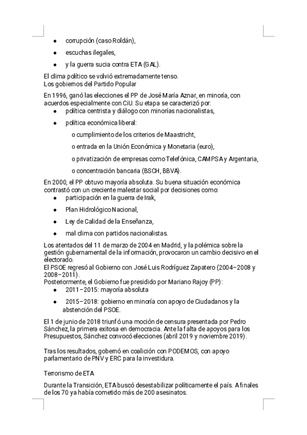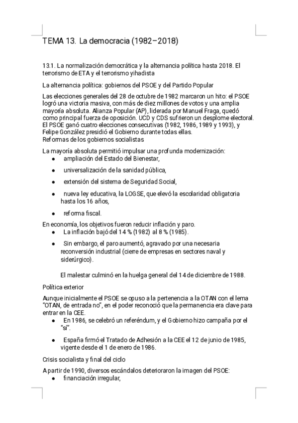 Estos apuntes del Tema 13 - La consolidación democrática ofrecen un resumen riguroso, visual y sencillo de estudiar, diseñado específicamente para la preparación de la PAU. Encontrarás explicaciones claras de la alternancia PSOE/PP hasta 2018, modernizac