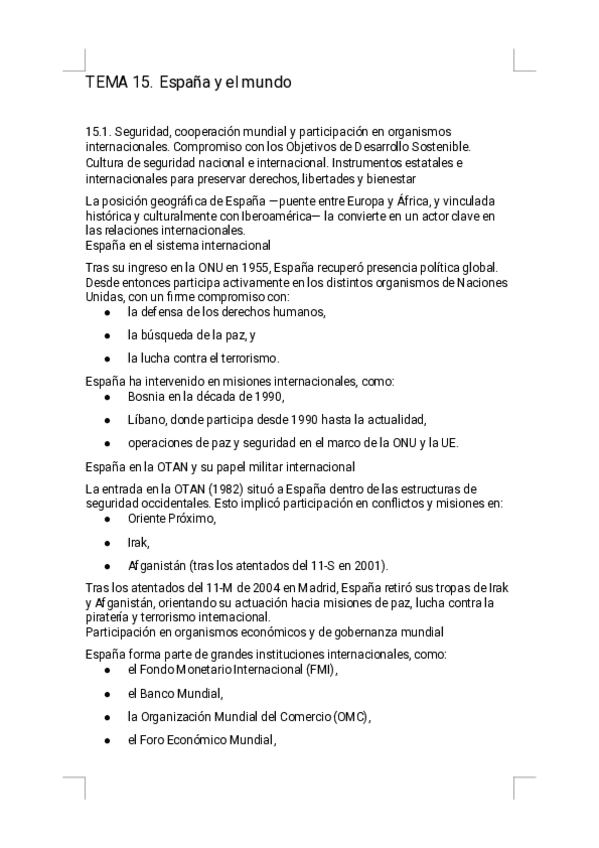 Estos apuntes del Tema 15 - España y el mundo ofrecen un resumen riguroso, visual y sencillo de estudiar, diseñado específicamente para la preparación de la PAU. Encontrarás explicaciones claras del posición geoestratégica de España, participación en la O