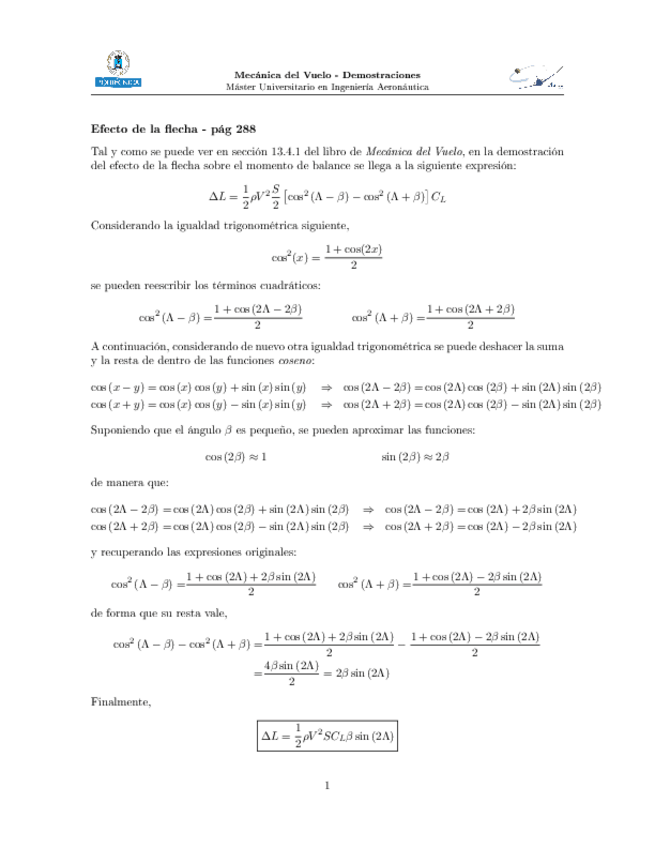 Demostración de la manipulación matemática en la demostración del momento de balance debido a la flecha del ala