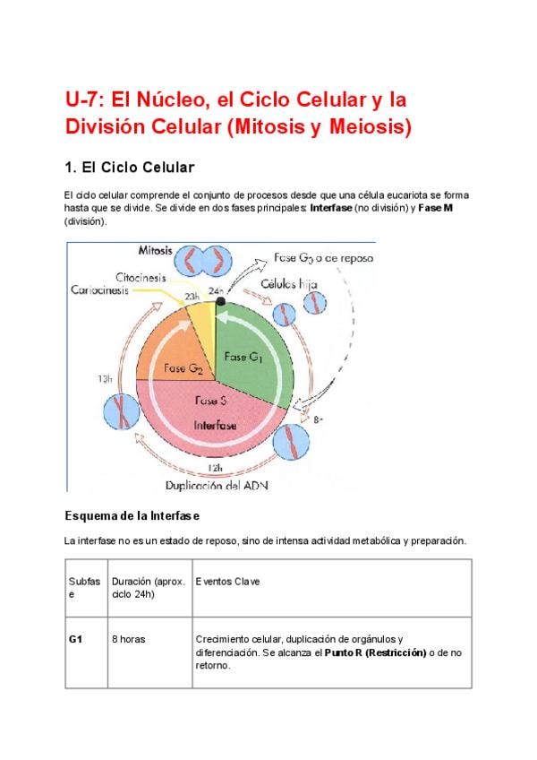 Apuntes completos del tema 7: EL NÚCLEO-EL CICLO CELULAR-DIVISIÓN CELULAR (Mitosis y Meiosis),bastante esquemáticos y con dibujos para bach y pau.