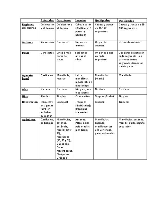 Diferencias entre los distintos artrópodos. Posible pregunta de exámenes.