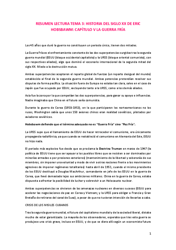 En dichos apuntes se encuentra todo el material que entra en el examen y temario de la asignatura sacados de la lectura obligatoria del libro de E. J. Hobsbawm Historia del siglo XX.