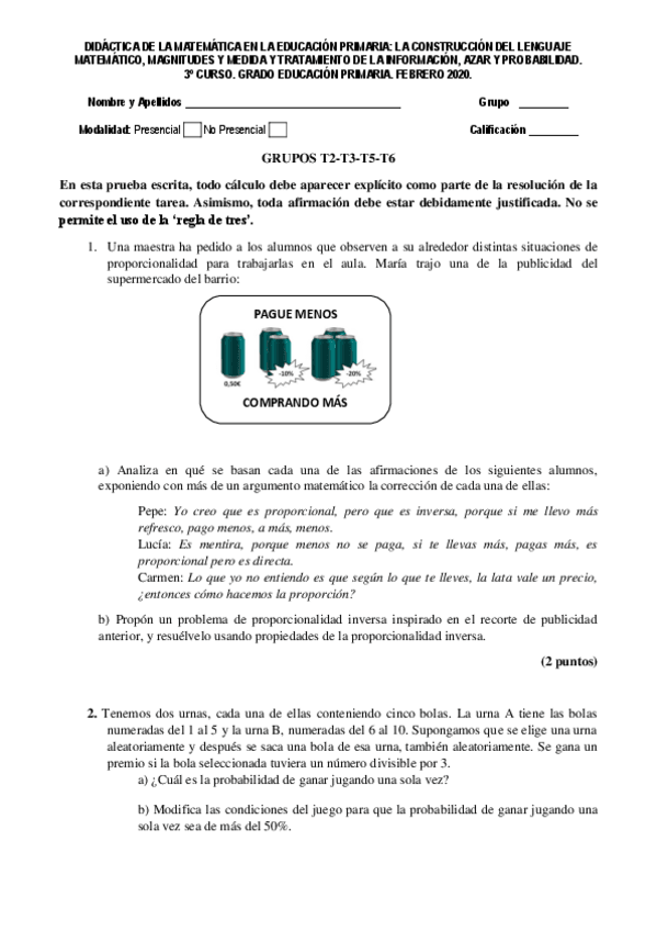 He publicado nuevos examenes de 3º Didáctica de la matemática en la educación primaria: la construcción del lenguaje matemático, magnitudes y medida y tratamiento de la información, azar y probabilidad: Examen Febrero 2020