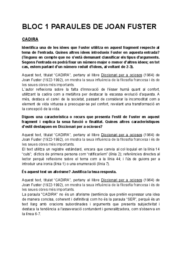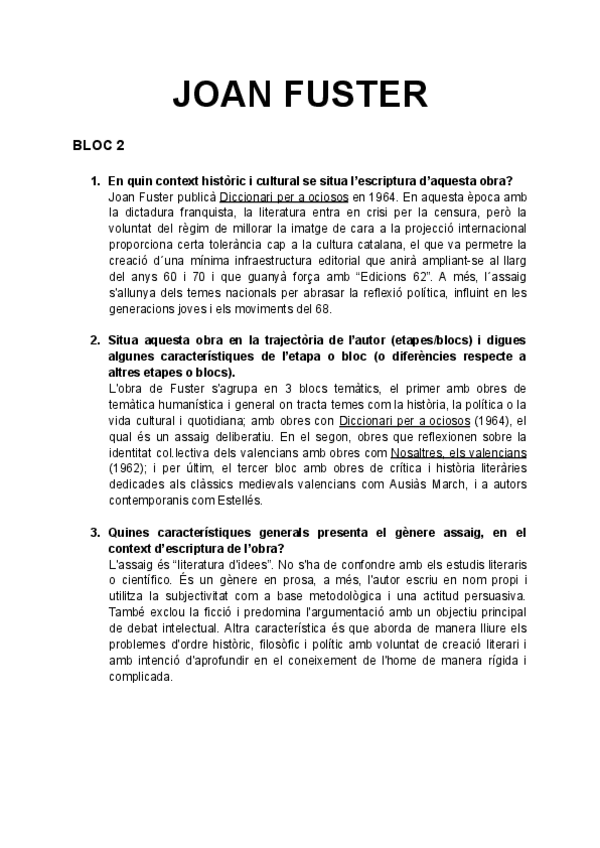 Literatura sobre Fuster, preguntas EBAU