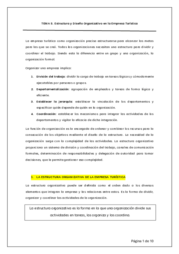 Tema 5 de Fundamentos de Administración de empresas turísticas. Función de la organización. Suerte :) Lo subrayado son las posibles preguntas qué mencionó Salustiano en la última clase.