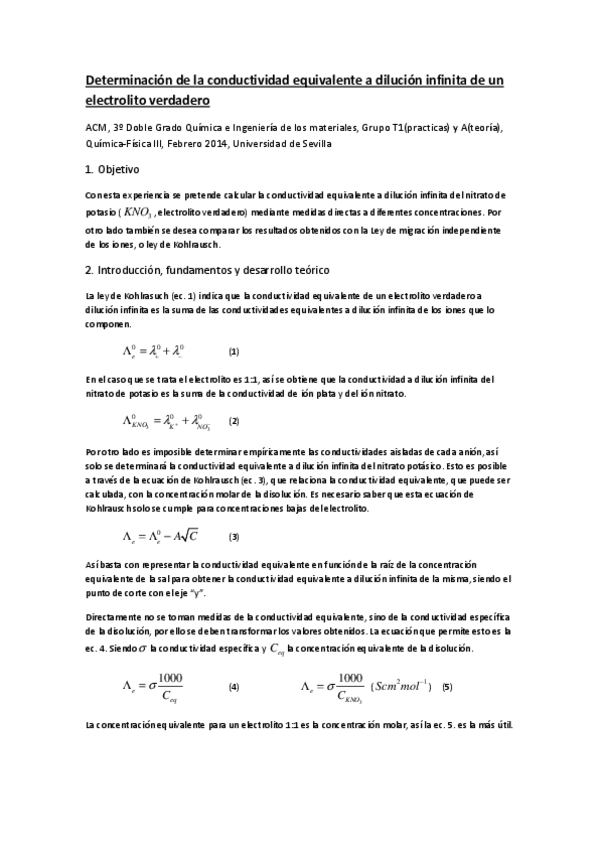 He publicado nuevos practicas de 3º Quimica Física III: Determinación de la conductividad equivalente a dilución infinita de un electrolito verdadero.pdf