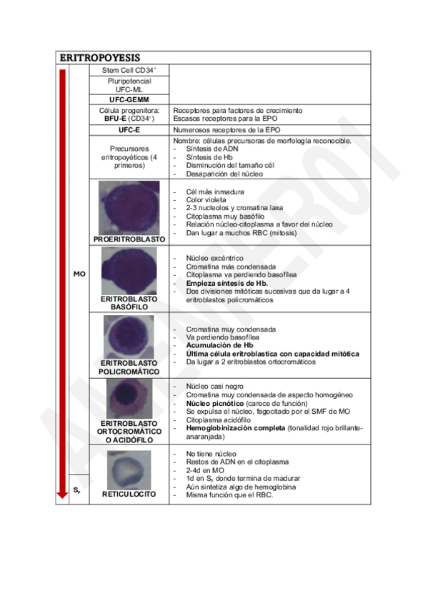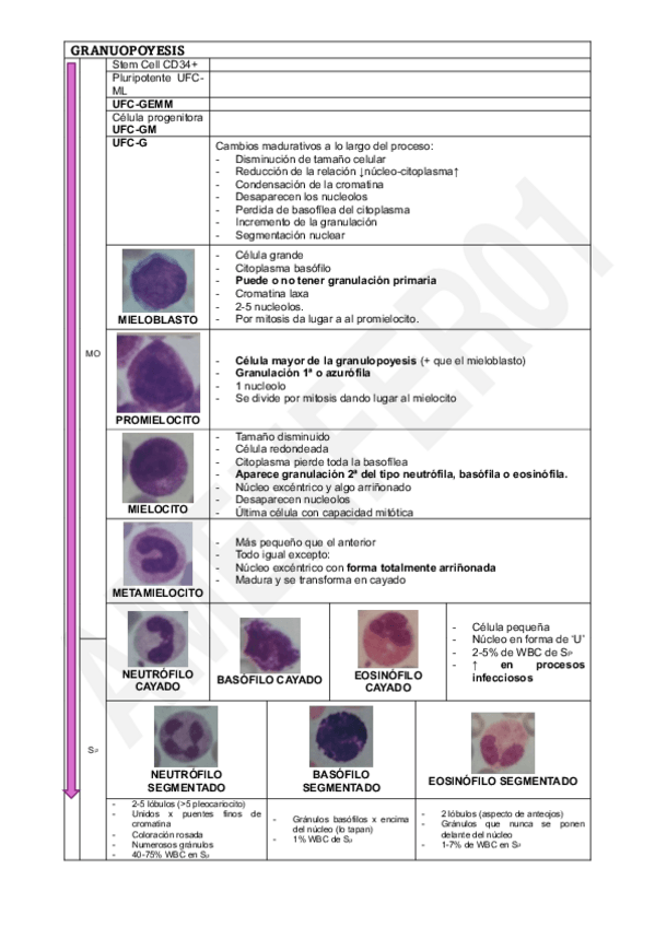 Tablas desde Stem-cell hasta maduración completa, junto a fotos y características de cada estadio. Eritropoyesis, linfopoyesis, granulopoyesis, monopoyesis y trombopoyesis.