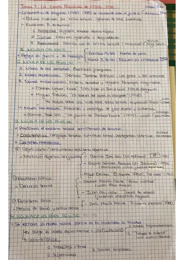 Resumen esquematizado del tema de literatura: novela española desde 1939 hasta 1975. Completo y fácil de estudiar