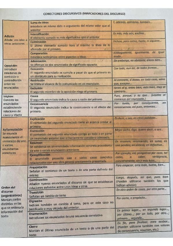 Tabla de marcadores del discurso con todos sus tipos y explicaciones. Muy útil y clave en los comentarios de texto