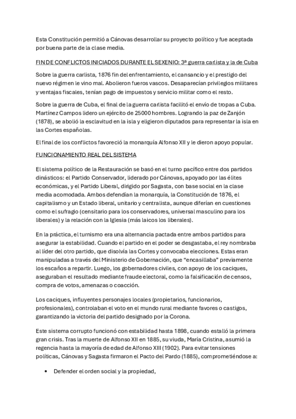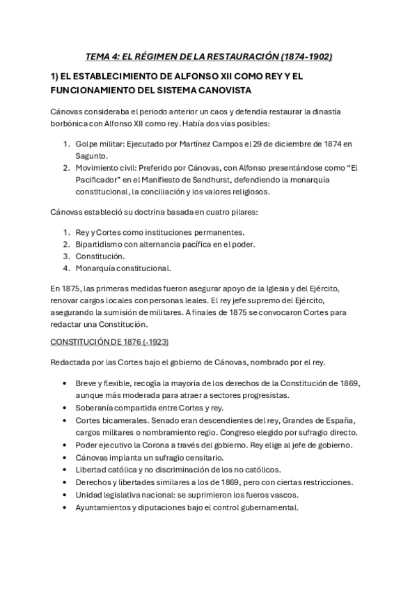 TEMA 4: EL RÉGIMEN DE LA RESTAURACIÓN (1874-1902) 1) EL ESTABLECIMIENTO DE ALFONSO XII COMO REY Y EL FUNCIONAMIENTO DEL SISTEMA CANOVISTA. 2) OPOSICIÓN POLÍTICA AL RÉGIMEN DE LA RESTAURACIÓN 3) CRISIS DEL 98 Y LIQUIDACIÓN DEL IMPERIO COLONIAL