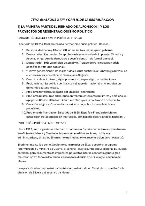 TEMA 5: ALFONSO XIII Y CRISIS DE LA RESTAURACIÓN 1) LA PRIMERA PARTE DEL REINADO DE ALFONSO XIII Y LOS PROYECTOS DE REGENERACIONISMO POLÍTICO 2) LA CRISIS DEL PARLAMENTARISMO. LA NEUTRALIDAD EN LA I GUERRA MUNDIAL 3) DICTADURA DE PRIMO DE RIVERA Y LA