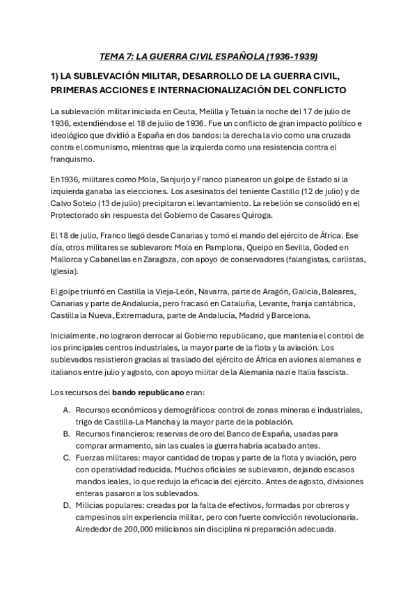 TEMA 7: LA GUERRA CIVIL ESPAÑOLA (1936-1939) 1) LA SUBLEVACIÓN MILITAR, DESARROLLO DE LA GUERRA CIVIL, PRIMERAS ACCIONES E INTERNACIONALIZACIÓN DEL CONFLICTO 2) LA GUERRA CIVIL: EVOLUCIÓN EN LAS DOS ZONAS Y SUS CONSECUENCIAS