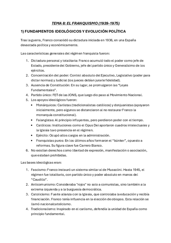 TEMA 8: EL FRANQUISMO (1939-1975) 1) FUNDAMENTOS IDEOLÓGICOS Y EVOLUCIÓN POLÍTICA 2) SOCIEDAD Y ECONOMÍA EN EL FRANQUISMO: DE LA AUTARQUÍA AL DESARROLLISMO