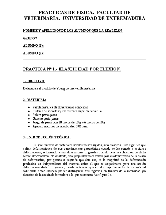 Nota = 10 Memoria de las prácticas: - Práctica nº 1 = ELASTICIDAD POR FLEXIÓN - Práctica nº 4 = DETERMINACIÓN DE LA DENSIDAD Y EL VOLUMEN DE UN SÓLIDO CON LA BALANZA HIDROSTÁTICA - Práctica nº 6 = CARGA Y DESCARGA DE UN CONDENSADOR: EL MARCAPASOS