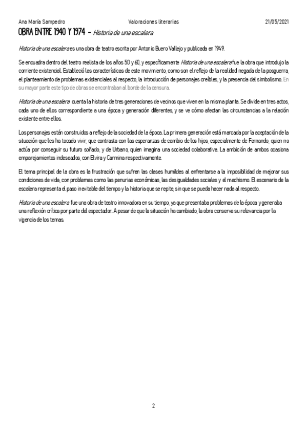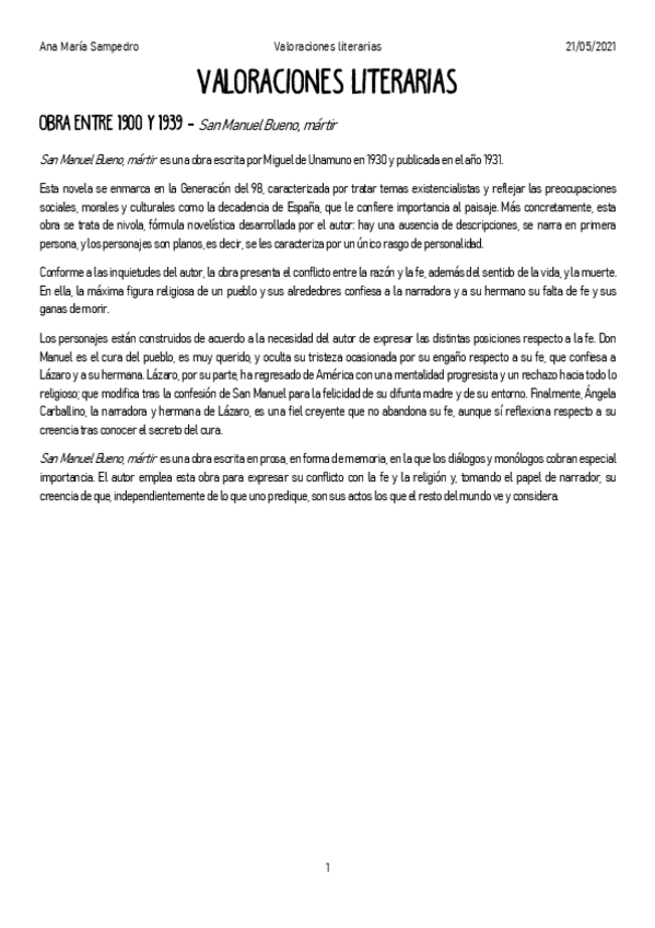 Valoraciones literarias adaptadas a la longitud de EvAU. Incluye: "San Manuel Bueno, Mártir", "Historia de una escalera" y "La ridícula idea de no volver a verte"