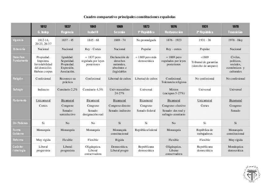 Cuadro comparativo de las principales constituciones españolas.