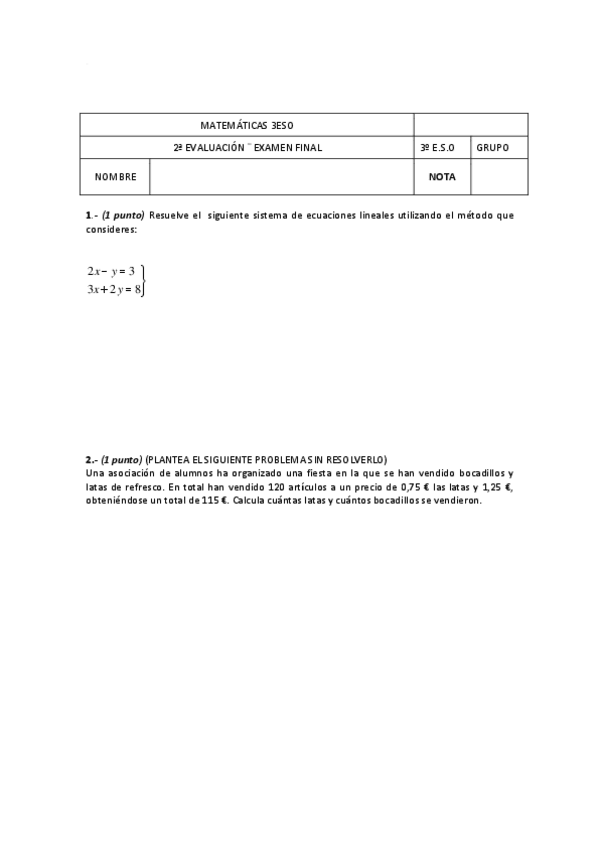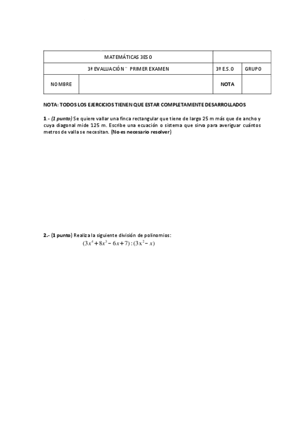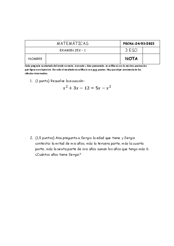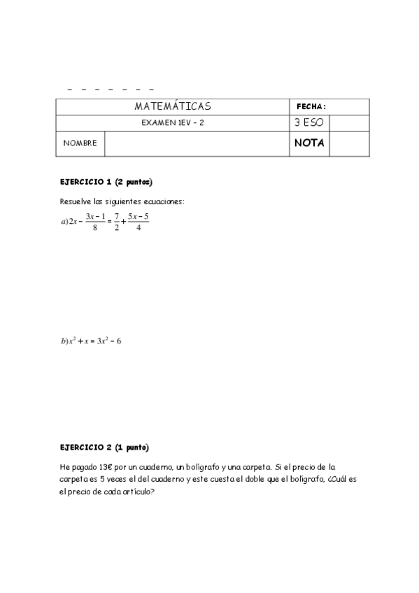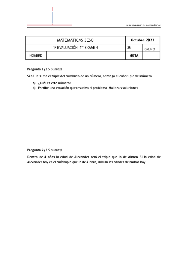 Examen matemáticas 3 Eso