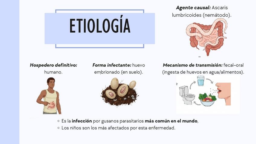 El PPT habla sobre la ascariasis, infección provocada por el nematodo Ascaris lumbricoides. El documento detalla la morfología del parásito, su taxonomía y el complejo ciclo de Loos. Analiza las manifestaciones clínicas en fases larvaria y de estado, incl