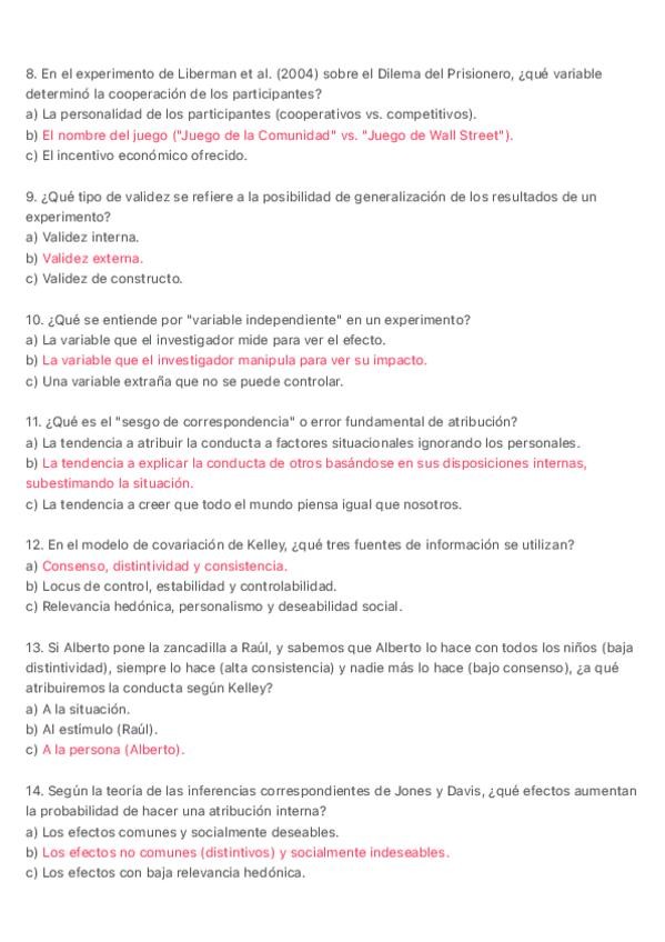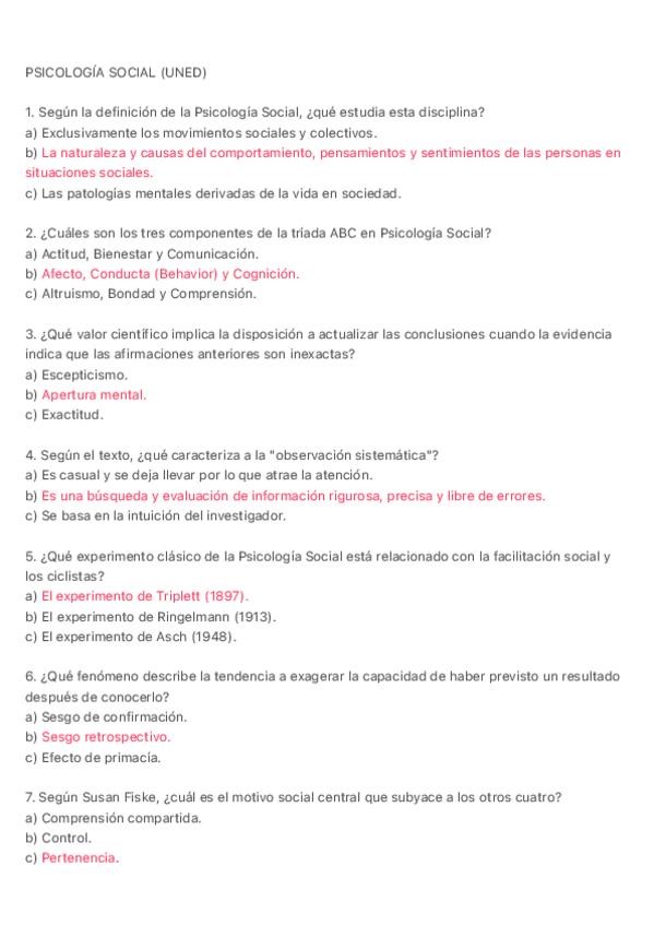 Preguntas de tipo test de para todos los temas de Psicología Social Vol. 1, orientados al examen. Con la respuesta subrayada para poder estudiar más fácilmente.
