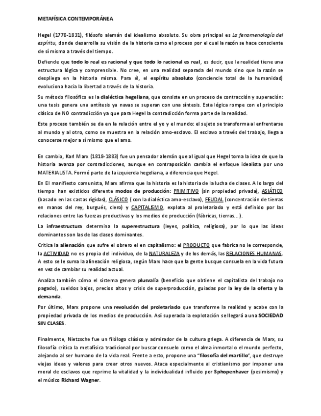 Resumen de la metafisica contemporánea de Hegel, Marx y Nietzsche, listo para estudiar de cara a la PAU