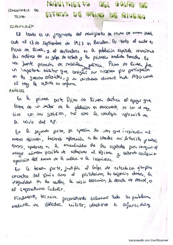 Comentario de texto Manifiesto del golpe de estado de Primo de Rivera