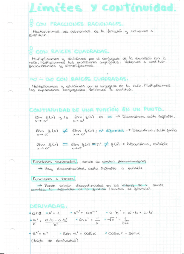 Tema de límites y continuidad, apuntes hechos a mano sin ejemplos, todo lista para el examen teniendo asi un resumen de todo el temario de estos apartados, sacados directamente de las explicaciones del profesor.