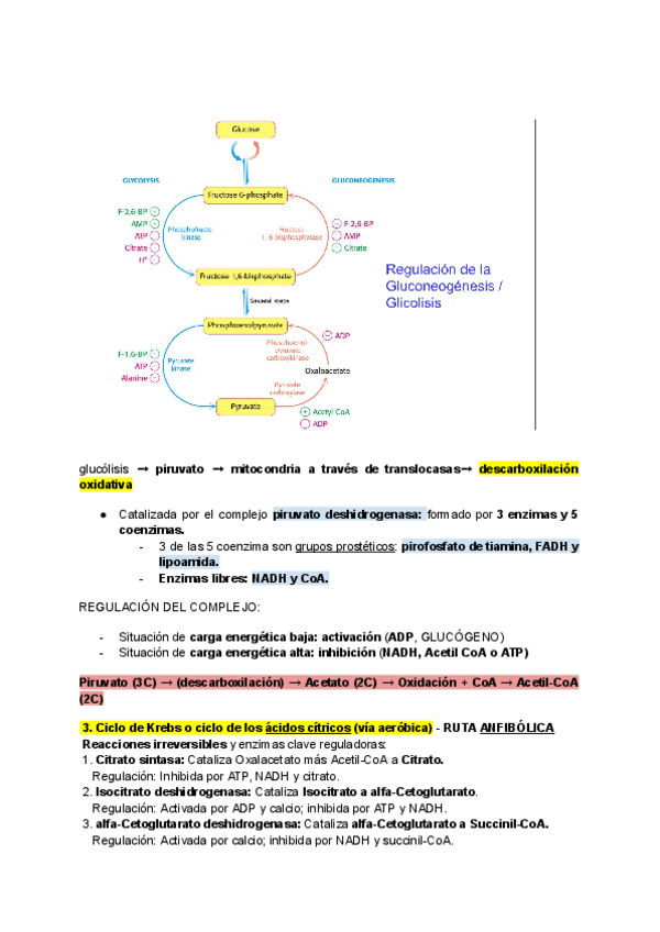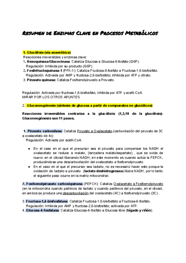 Resumen procesos metabólicos y enzimas clave.
