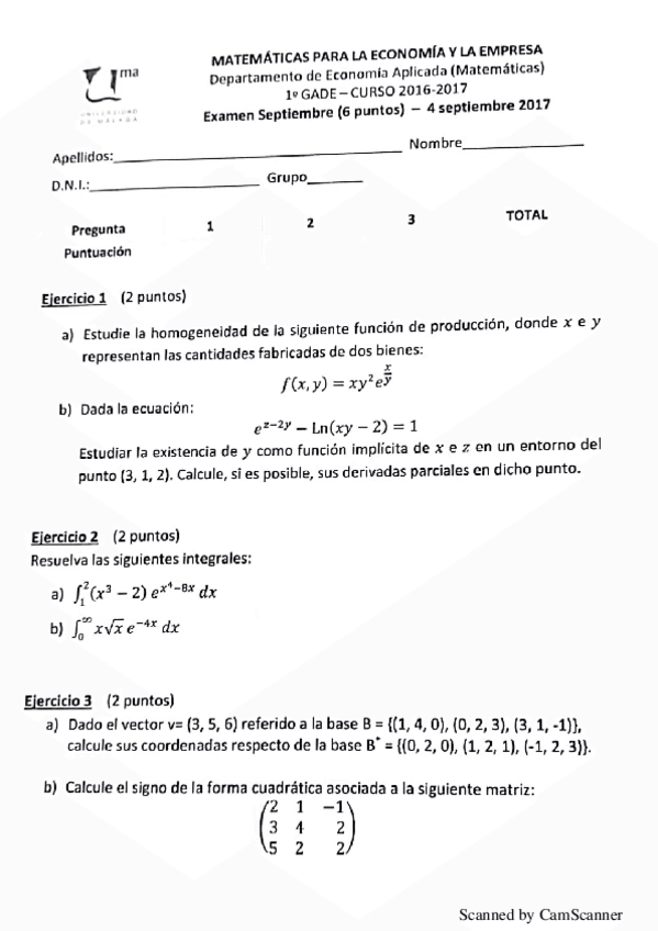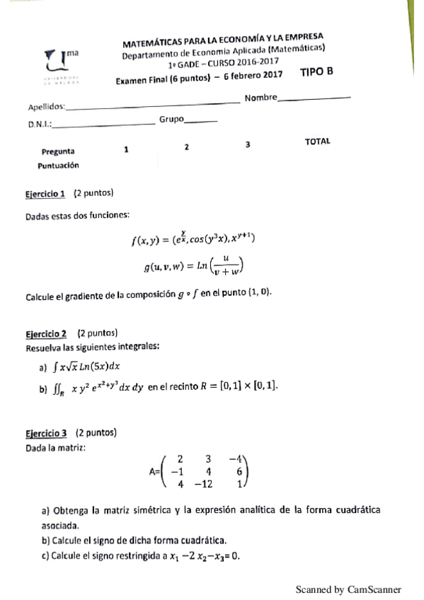 He publicado nuevos examenes de 1º Matemáticas para la Economía y la Empresa: Examen Matemáticas.pdf