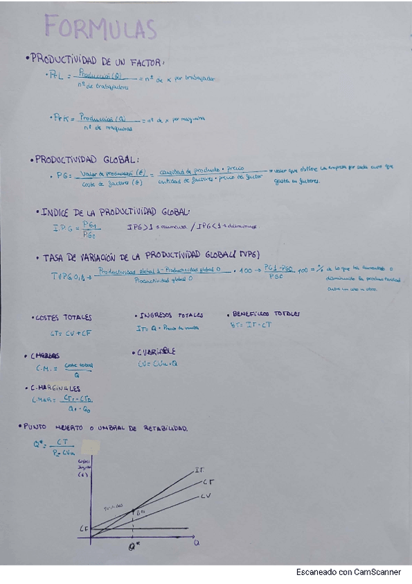 Este archivo contiene apuntes con las formulas de los problemas de economía: Productividad, Punto muerto, Periodo medio de maduración, Modelo de Wilson con y sin stock, Pay-back, VAN, TIR, Préstamo francés, Ratios, Balance, Fondo de maniobra