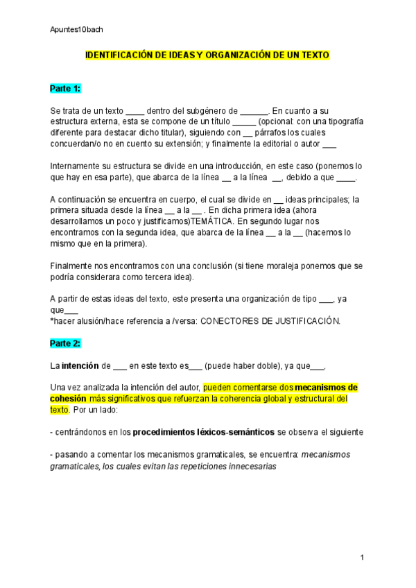 Resumen de los tipos de organización de texto y guía para completar las 2 primera preguntas del BLOQUE 1 de SELECTIVIDAD ANDALUCÍA