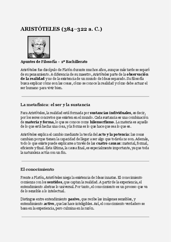 Resumen de Aristóteles filosofía 2º bachillerato super fácil y para sacar un 10 (comprobado antes por mi) ;)