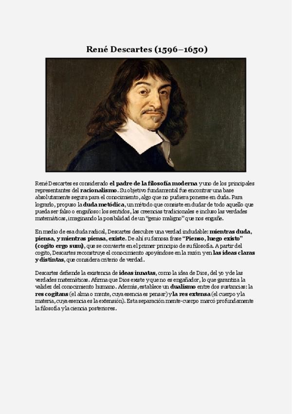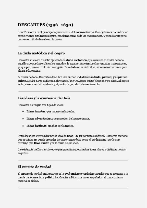 Resumen concreto, sencillo y clave de Descartes con el que seguro sacas un 10