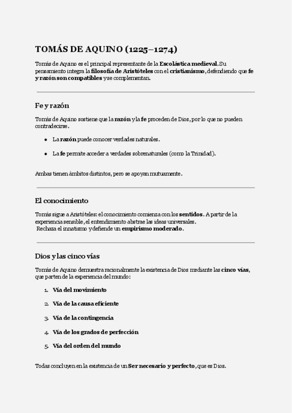 Resumen sencillo Tomás de Aquino Filosofía 2º Bachillerato