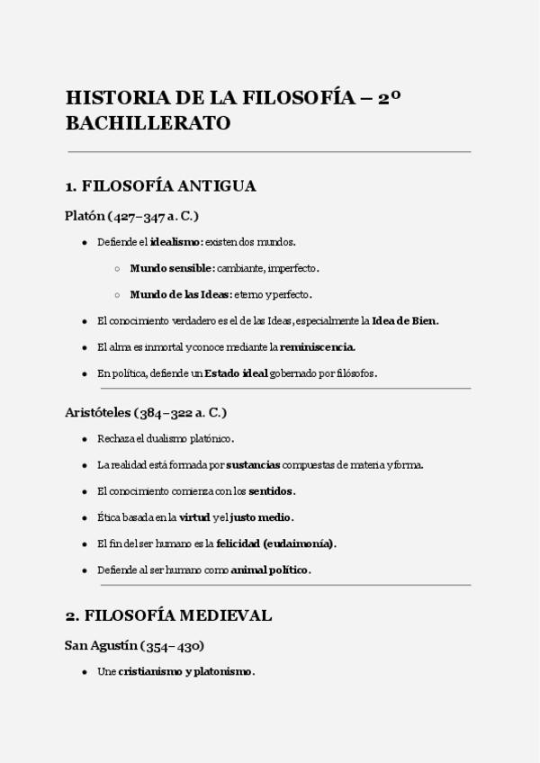 Resumen de todo el temario de historia de la filosofía de 2º de bachillerato perfecto para repasar y sacar un 10.