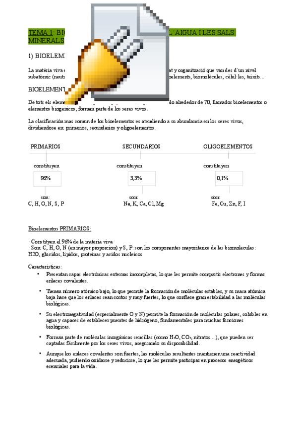 Apunts 2 bach biología Tema 1: base química de la vida / bioelements i biomolècules (valencià/català)