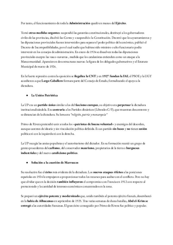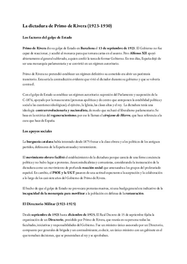 Resumen de 3 páginas de la dictadura de Primo de Rivera. Historia de España de segundo de Bachillerato.