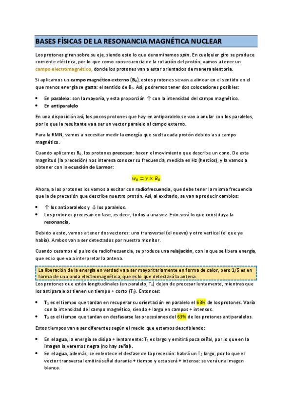Resumen útil para entender la base de las imágenes de resonancia