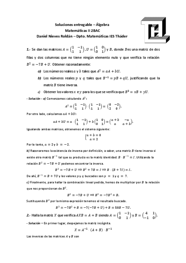 He publicado nuevos ejercicios de 2º Matemáticas II: entregable-algebra.pdf