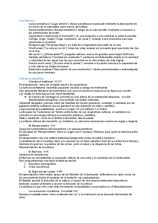 Los tópicos, literatura medieval, literatura del renacimiento, del barroco, del siglo de las luces y del romanticismo