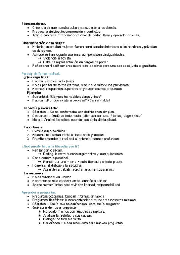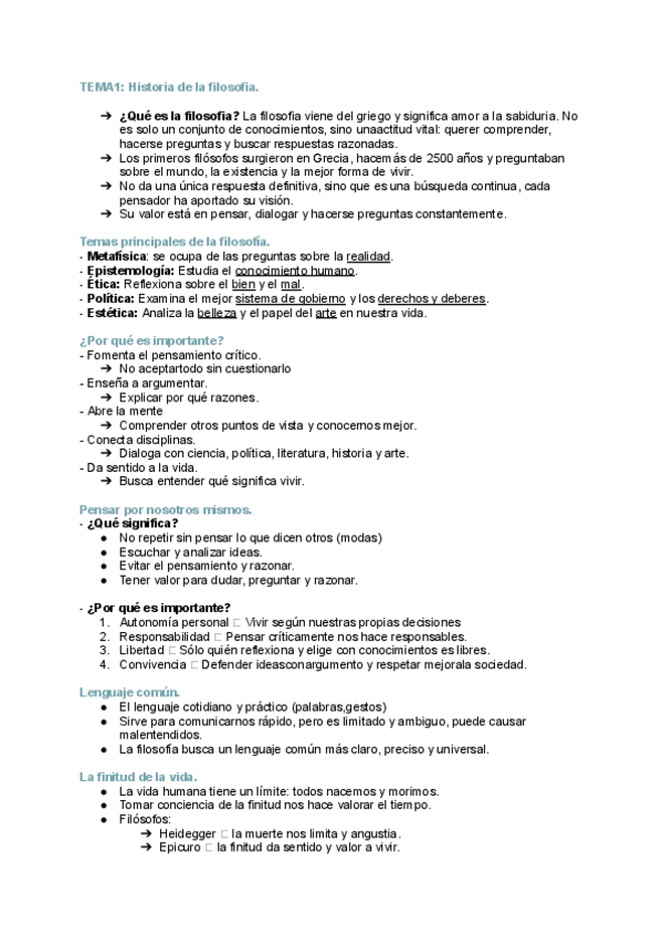 La historia de la filosofía: ¿qué es la filosofía?, temas principales de la filosofía, ¿por qué es importante la filosofía?, pensar por nosotros mismos, lenguaje común, la finitud de la vida, etnocentrismo, discriminación de la mujer, pensar de forma rad
