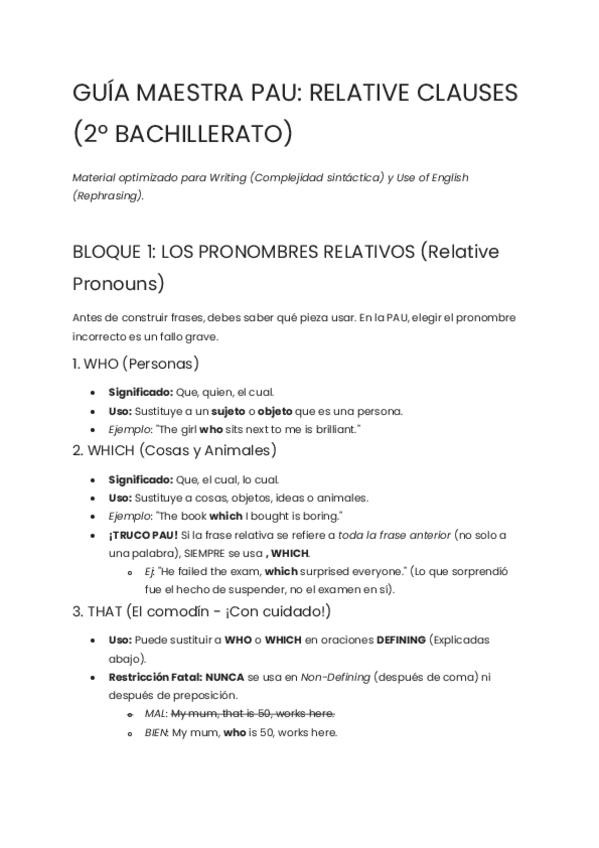 GUÍA MAESTRA PAU: RELATIVE CLAUSES (2º BACHILLERATO) aplicado a la pau muy bien exlicado, claro y organizado