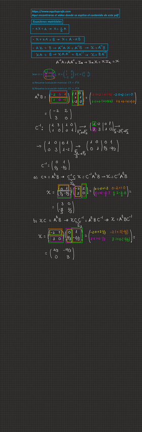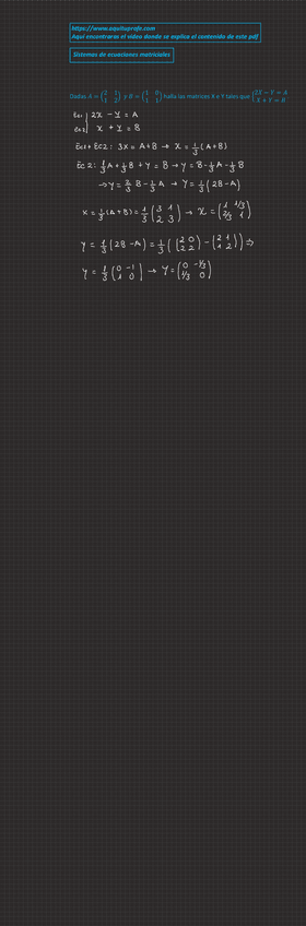 Apuntes completos de ecuaciones y sistemas de ecuaciones matriciales con enlace a web donde ver los vídeos del profesor