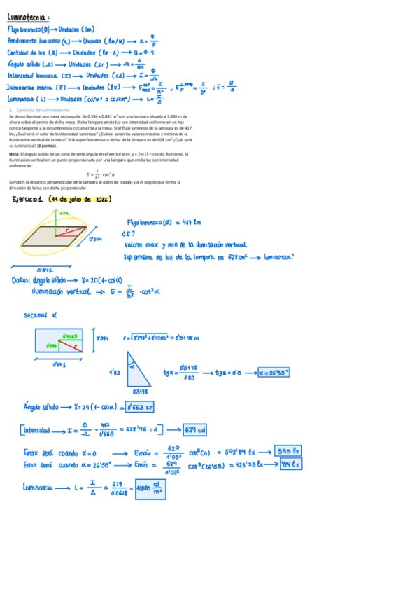 Ejercicios resueltos de luminotecnia con las fórmulas necesarias para hacerlos