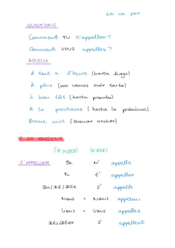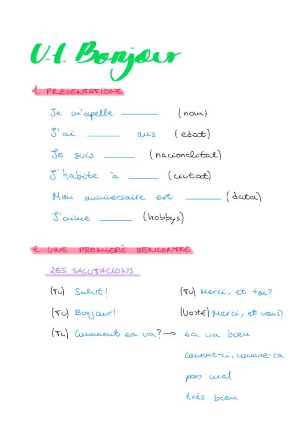 Incluye: presentatione, une premierè rencontre, le present (verbs), les jours de la semaine, les mois de l'anneé, la phrase négative, la structure interrogative, les mois interrogative, les nationalités, les prepositions devant ville/pays, plus ou mois y