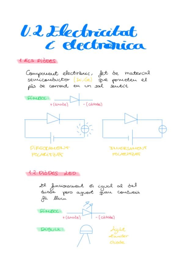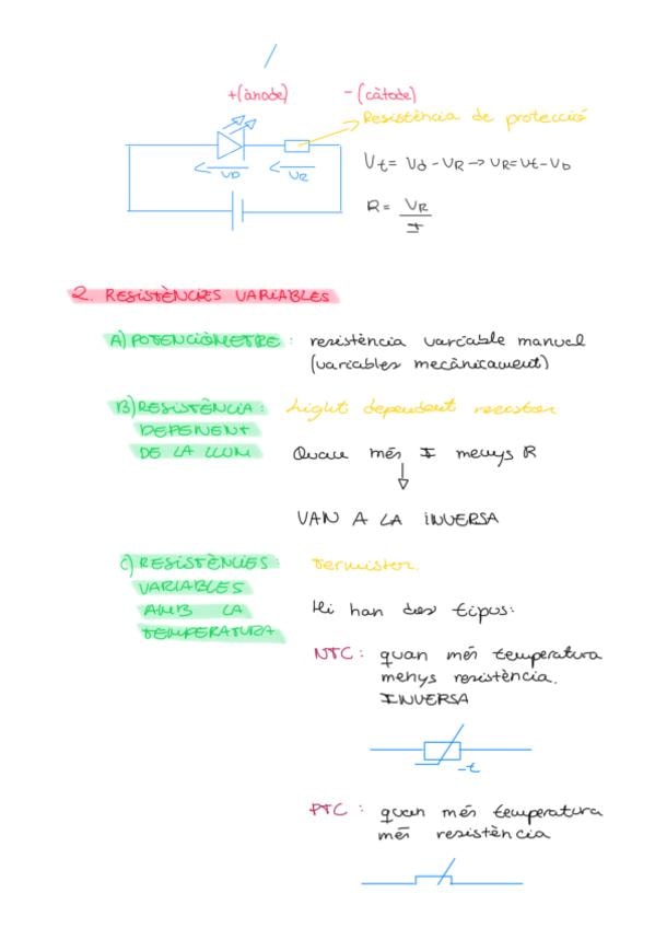 Els diodes (i diodes led), resistències variables (potenciòmetre, resistència depenent de la llum i resistències variables amb la temperatura, condensadors (ceràmics, electrolítics i les fòrmules). Tot molt ben explicat i resumit, amb les fòrmules claus i
