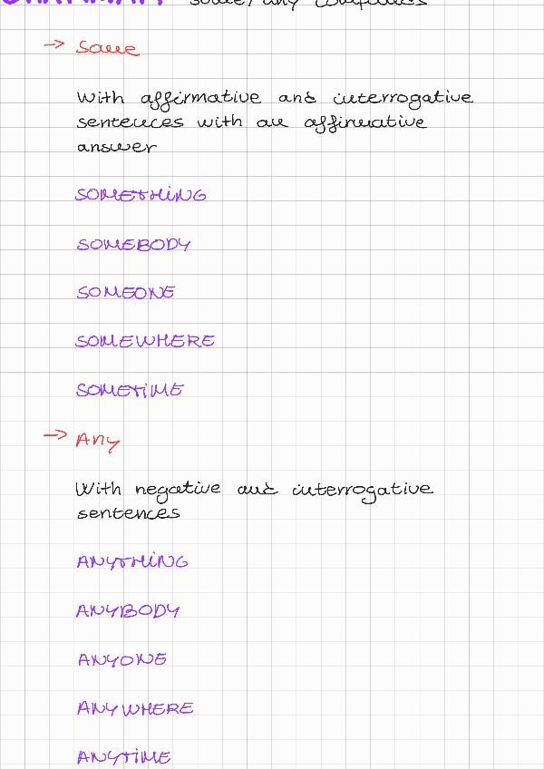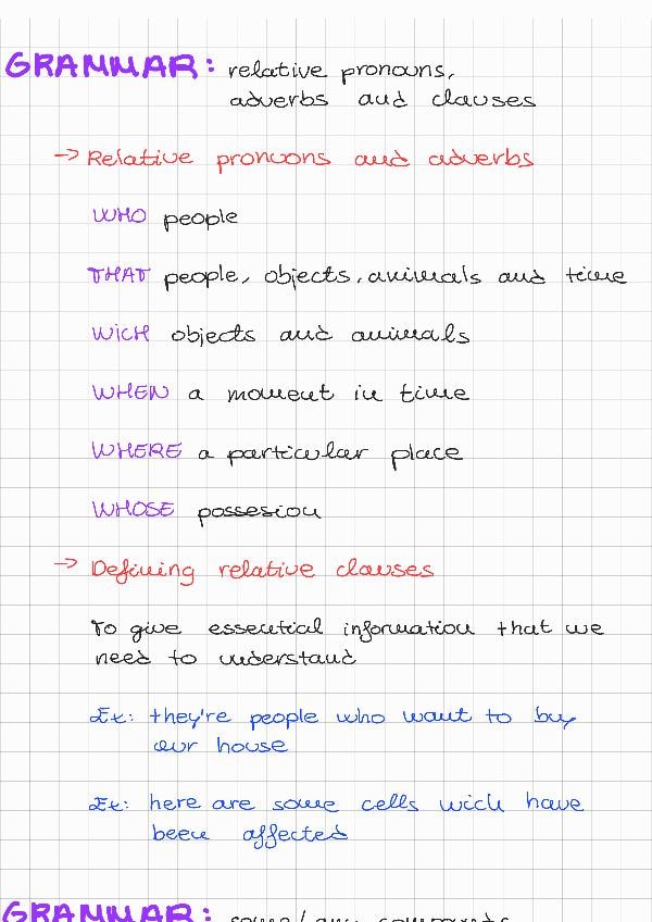 Incluye: relative pronouns, adverbs and clauses, some and any compounds, vocabulary of verbs, urban landscapes and places arround town
