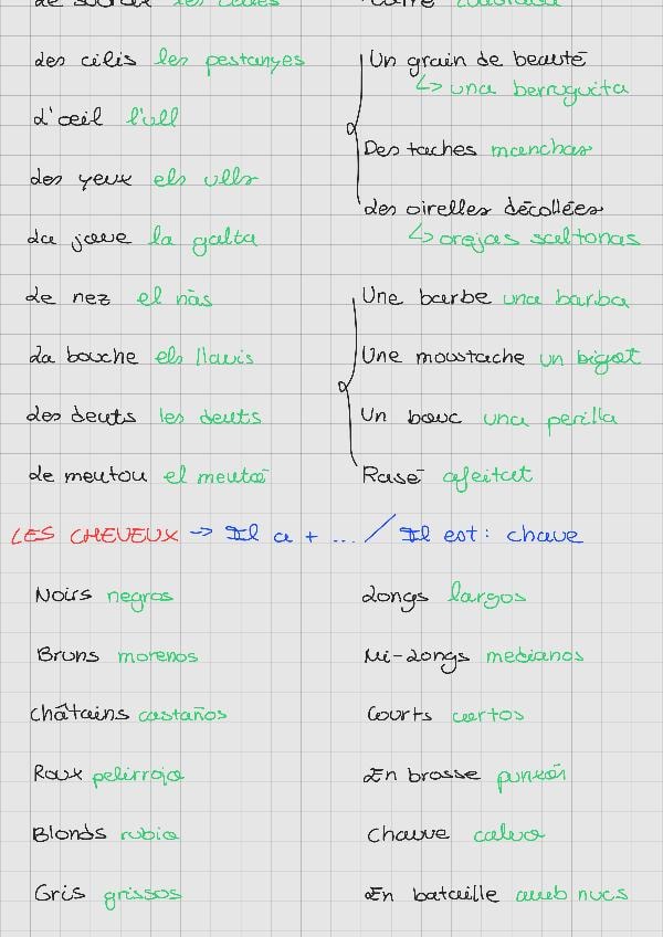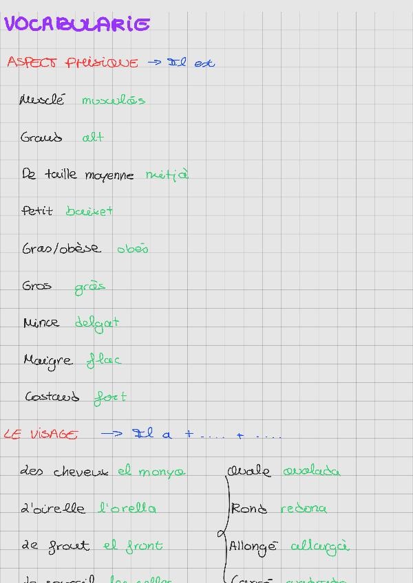 Incluye: vocabulaire (aspect phisique, parts du corps, le caractere, sports) garammaire para el vocabulaire (fait du, faire de la, faire d') y les articles, les articles contractés pour activités, le pluriel, le femenin, c'est et il est, y la negatione