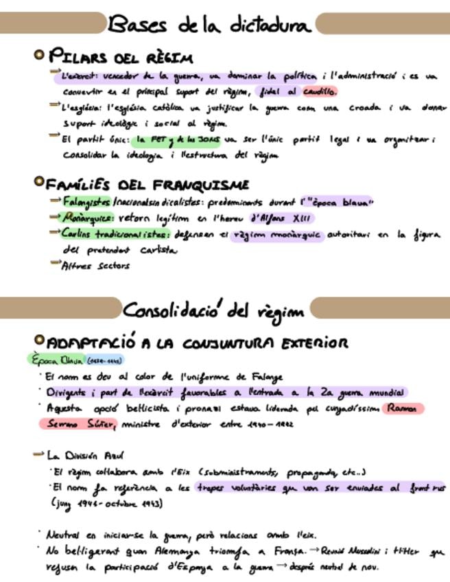 Apunts en català subrallats sobre la primera etapa del franquisme, ideal per la PAU/Selectivitat,