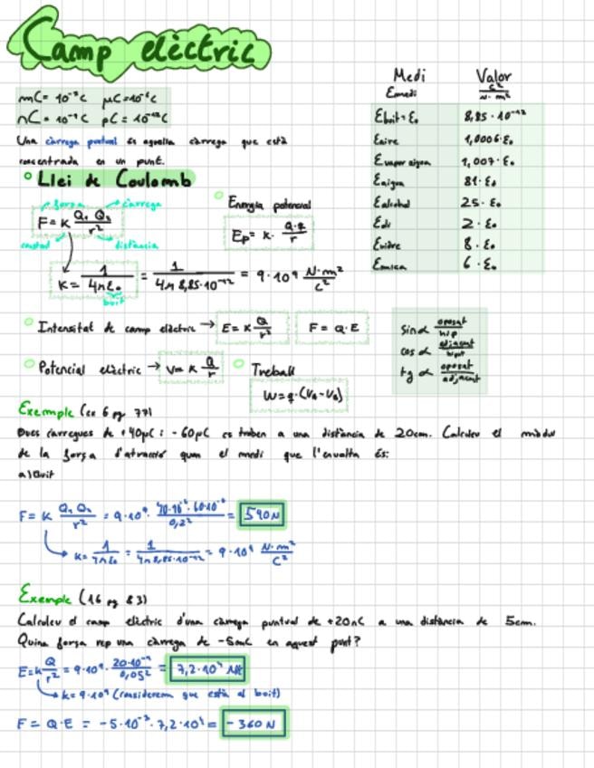 Apunts sobre el tema de Camp Elèctric, física segon de batxillerat. Els exercicis resolts són del llibre de la editorial McGrawHill.