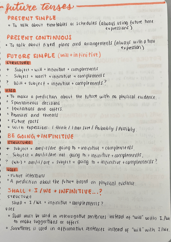 present simple, present continuous, future simple, perfect and continuous, be going to, shall i/we, was were going to and others ways of future